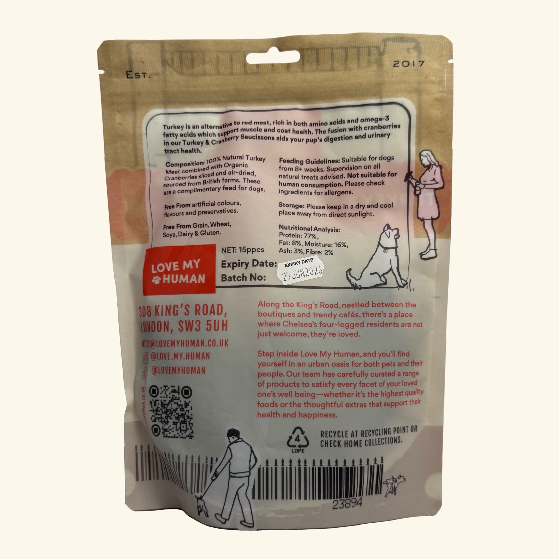 Composition: 100% natural turkey meat combined with organic cranberries sliced and air-dried and sourced from British farms and contain no other ingredients. Free from artificial ingredients and preservatives. Grain, wheat, soya, dairy & gluten free.