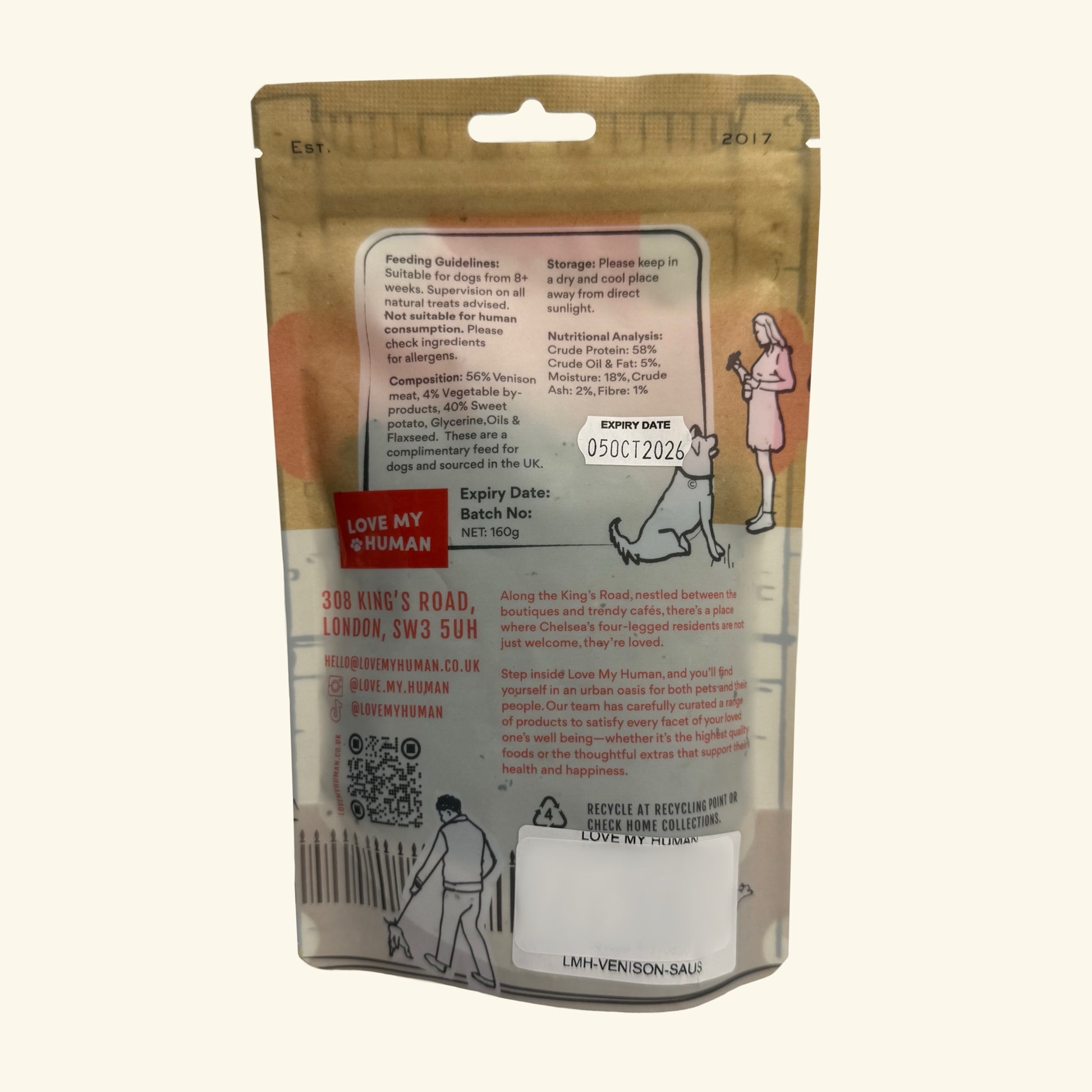 Composition: 56% Venison meat, 4% vegetable product, 40% sweet potato, glycerine, oils & flaxseed are a complimentary feed for dogs and are sourced in the UK.